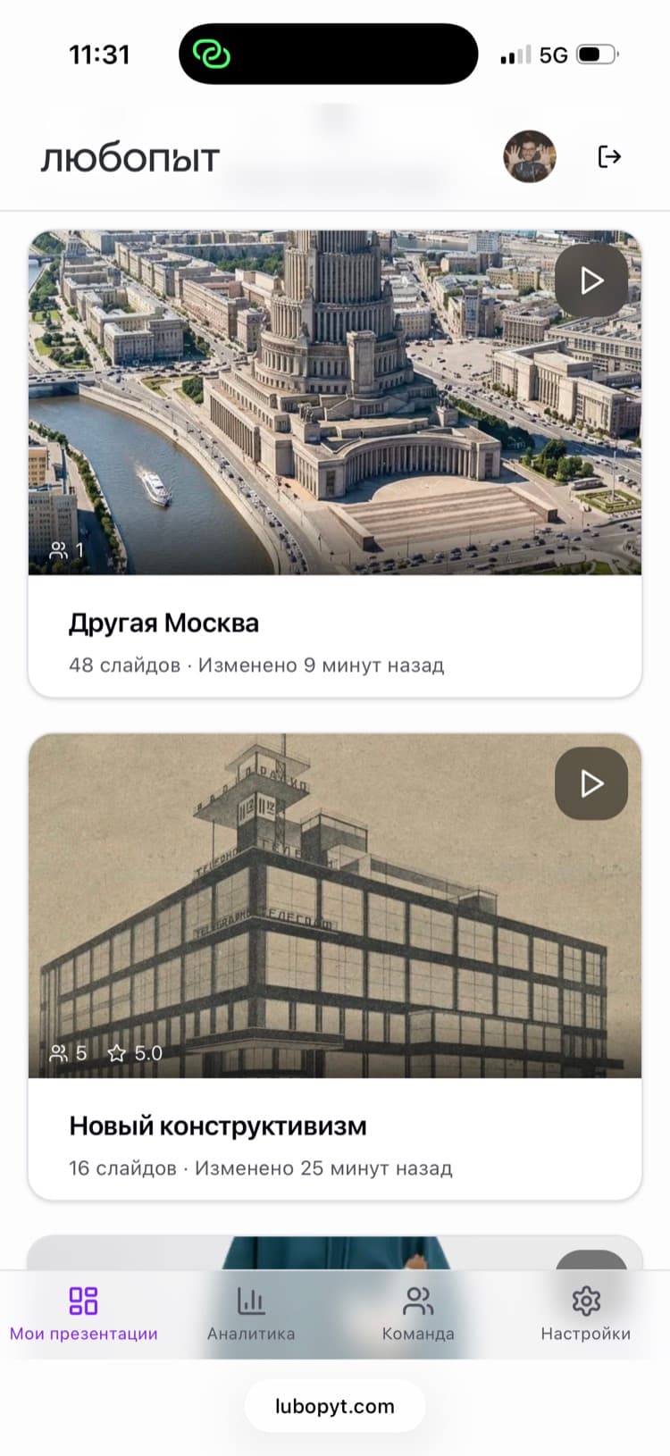 Familiar vertical interface like Instagram. Full-screen photos, progress bar, swipes — intuitive and beautiful.